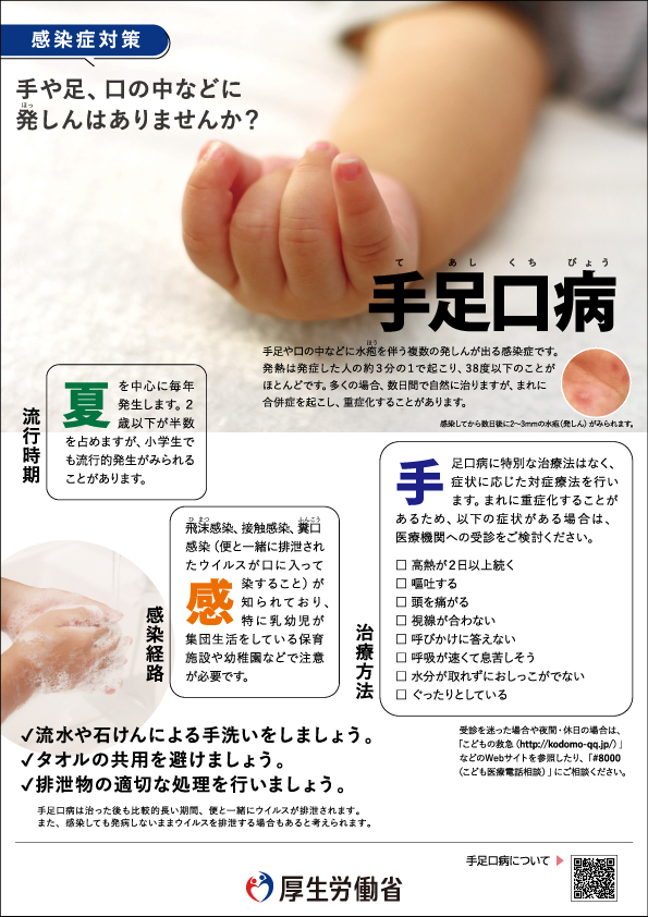 また、乳幼児は手足口病の原因となるウイルスに感染したことがなく、そのウイルスに免疫のない者の割合が高いため、感染した子どもの多くが発病します。
