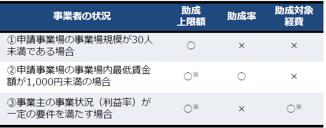 また、上記の要件を満たしたうえで、以下に当てはまる場合は、助成上限額・助成率・助成対象経費の特例的な拡充が受けられます。