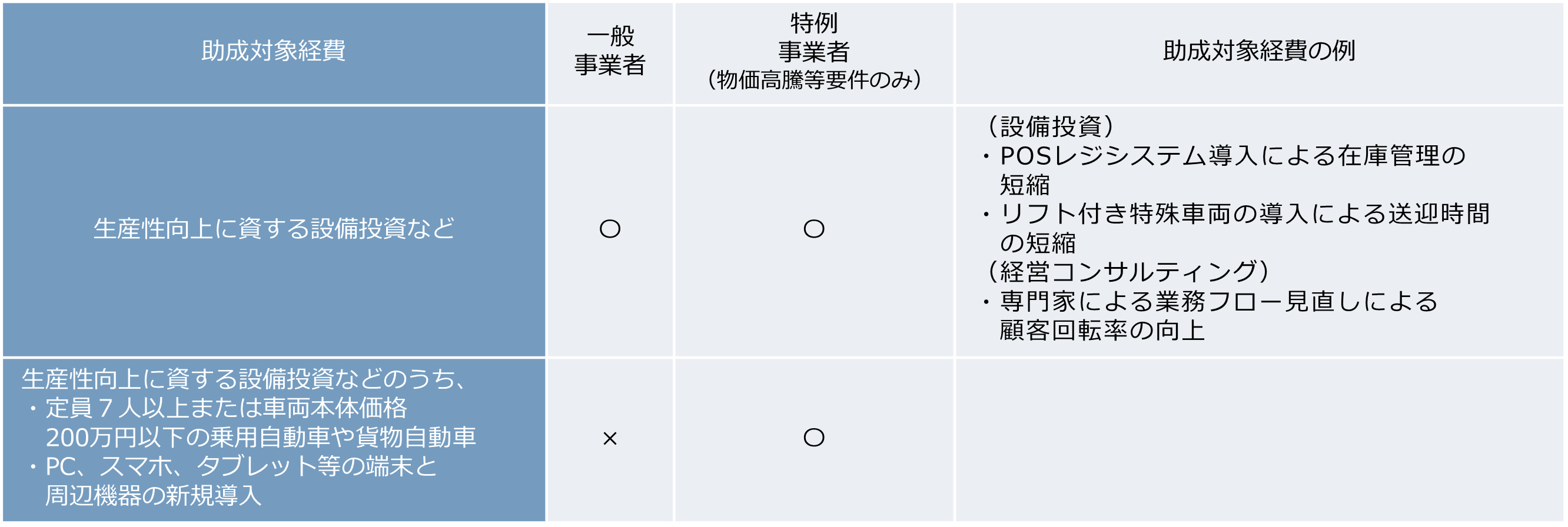 助成対象となる経費は「生産性向上・労働能率の増進に資する設備投資等」です。