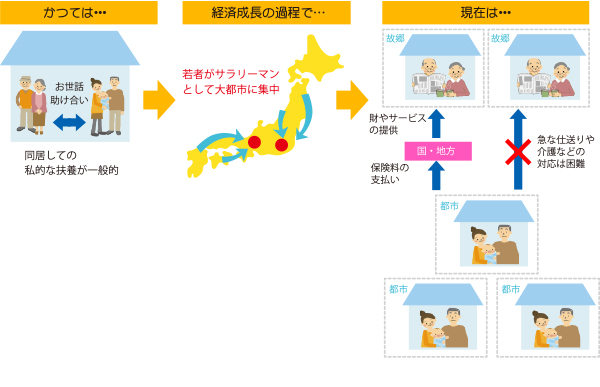 ですが、戦後の日本では、地方から都会に出てサラリーマンになる若い人が増え(都市化)、都市部に人口が集中していきました。また、その人たちが都市部で家庭を持ち、親と離れて夫婦と子どもだけ(核家族)で暮らすことが一般的になったため、親と同居もしくは近居して扶養することが難しくなっていったのです。