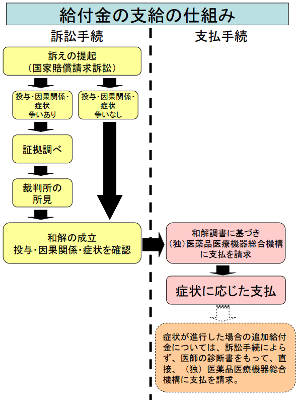 A.裁判手続の中で製剤投与の事実、因果関係、症状が認められた場合の弁護士費用について、法律により支給を受ける金額 の5%相当額を国が負担します。さらに、提訴に際し、裁判所に納める費用が払えない場合は、 訴訟救助(そしょうきゅうじょ)という制度があります。訴訟救助の主な対象は、訴状に貼る収入印紙代などです。同制度の活用については、弁護士等へご相談ください。