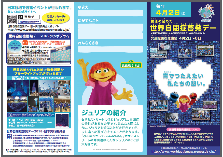 これに先立ち、「セサミストリート」で2017年に登場した自閉症の特性のあるキャラクターの「ジュリア」とその友達でジュリアの良き理解者である「エルモ」と「クッキーモンスター」を啓発のポスターに起用し、2月中旬から全国の自治体を通じて、学校、保育所、福祉関係施設、地域の公民館等に加え、医療機関や鉄道会社に配布します。(ポスター約7万枚)