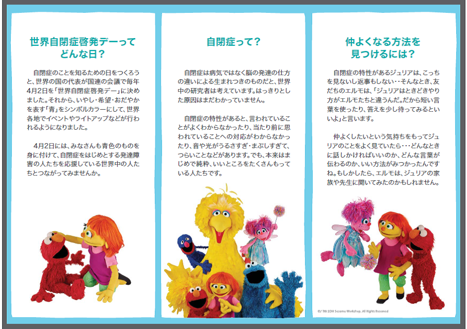 また、リーフレットには、より多くの人の目に留まるように「セサミストリート」の人気キャラクターである「ビッグバード」「アビー」「グローバー」を起用し、誰にでも分かりやすいように「世界自閉症啓発デーってどんな日?」、「自閉症って?」、「仲良くなる方法を見つけるには?」という簡易な表現によって、発達障害を知ってもらえる工夫を行っています。