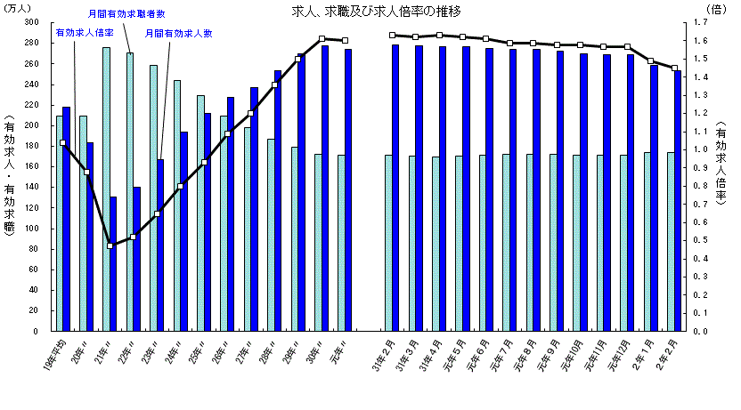 2月の有効求人(季節調整値)は前月に比べ2.2%減となり、有効求職者(同)は0.3%増となりました。