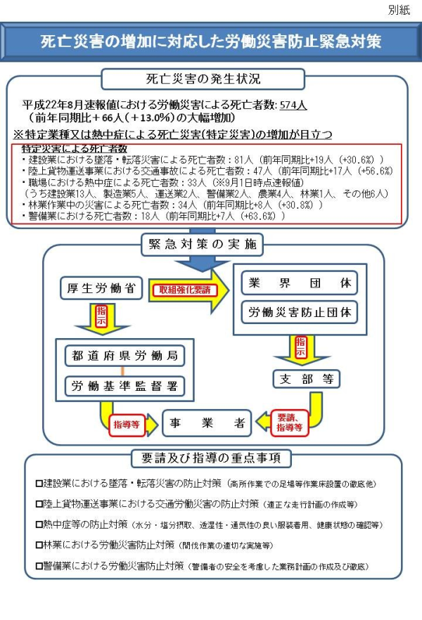 厚生労働省は、8月公表の速報値で、労働災害における今年の死亡者数が前年同期に比べて13.0%と大幅に増加したことを受け、別紙の労働災害防止緊急対策を実施することとし、各都道府県労働局長に指示しました。