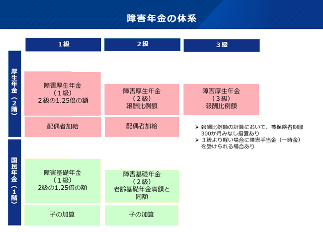 また、加給年金は、障害等級1・2級の場合に、受給権者に生計を維持されている65歳未満の配偶者がいるときに加算される[12]。他方、障害等級3級の場合には最低保障額が設定されている。