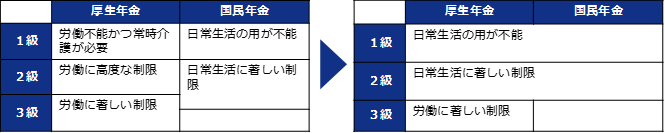 なお、障害の程度の判定の仕組みについては、障害等級表が見直されたことに伴い、これまで国民年金と厚生年金で異なっていたものが、1・2級ともに「日常生活の制限度合」を考慮した基準に統一されるとともに、3級については旧厚生年金の考え方が引き続き維持されることとなった。