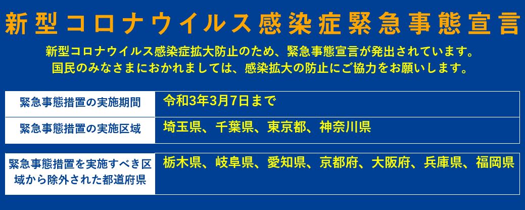3/7までを期限として埼玉県、千葉県、東京都、神奈川県に緊急事態宣言が発出されています。