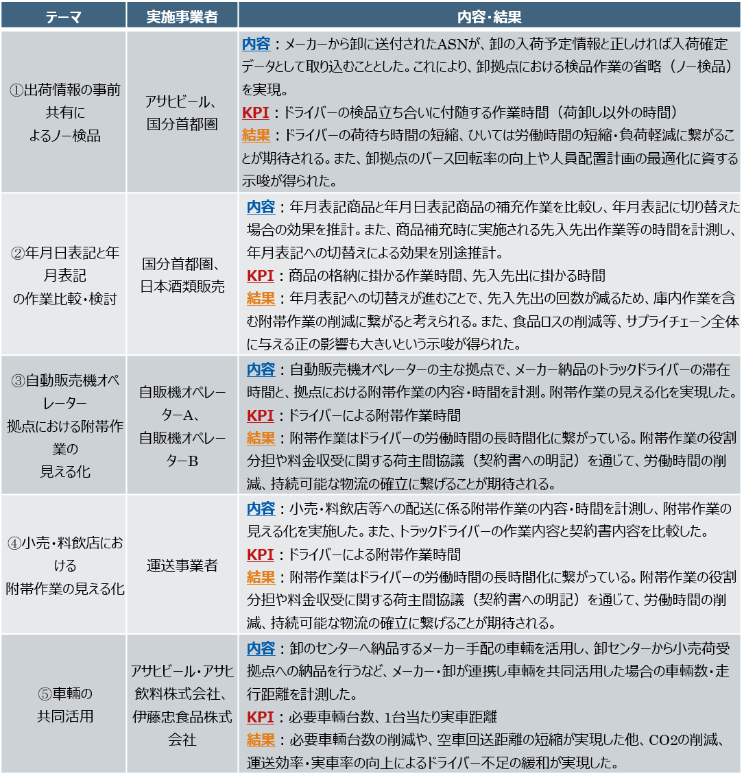 令和2年度は、荷待ち時間の発生件数が多かった飲料・酒物流について、引き続き、トラック運送事業者、発着荷主等の関係者が連携した飲料・酒合同会議を設置し、実証実験などを通してサプライチェーン全体での検討を実施してきました。