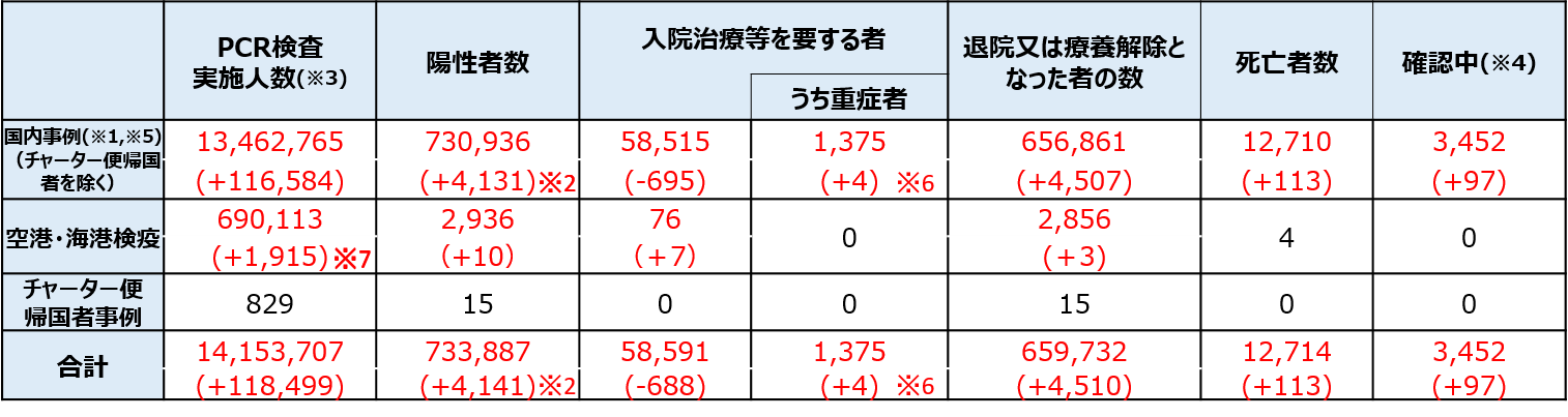 令和3年5月28日0:00現在、検査陽性者733,887例が確認されている。