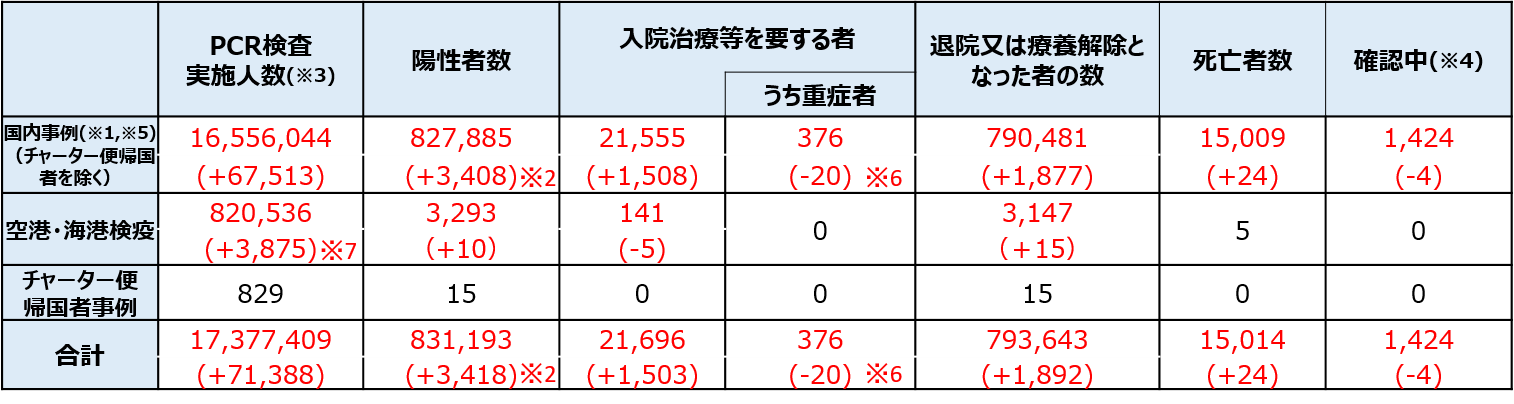 ※7:令和2年7月29日から順次、抗原定量検査を実施しているため、同検査の件数を含む。なお、空港・海港検疫の検査実施人数等については、公表日の前日の0時時点で計上している。
