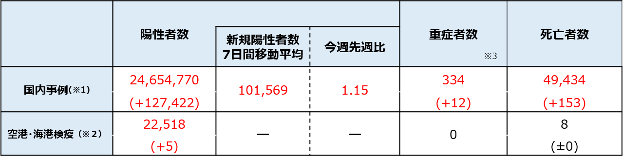 ※1:国内事例については、令和2年5月8日公表分から(退院者及び死亡者については令和2年4月21日公表分から)、データソースを従来の厚生労働省が把握した個票を積み上げたものから、各自治体がウェブサイトで公表している数等を積み上げたものに変更した。また、全数届出見直しを受け、令和4年9月27日公表分から、各自治体からHER-SYSにおいて報告された総数を積み上げたものに変更した。