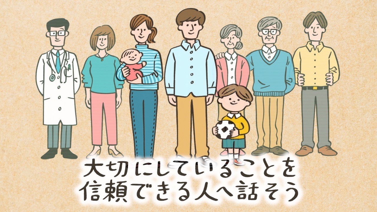 今回の動画は、「人生会議」について、より多くの方に知っていただくため、アニメーションを用いたショートムービーを2つ作成しました。アニメーションのイラストは、イラストレーターの川原瑞丸(かわはら・みずまる)さん、クリハラタカシさんに作成いただきました。この動画を視聴いただき「人生会議」について考えるきっかけとしていただければと考えております。