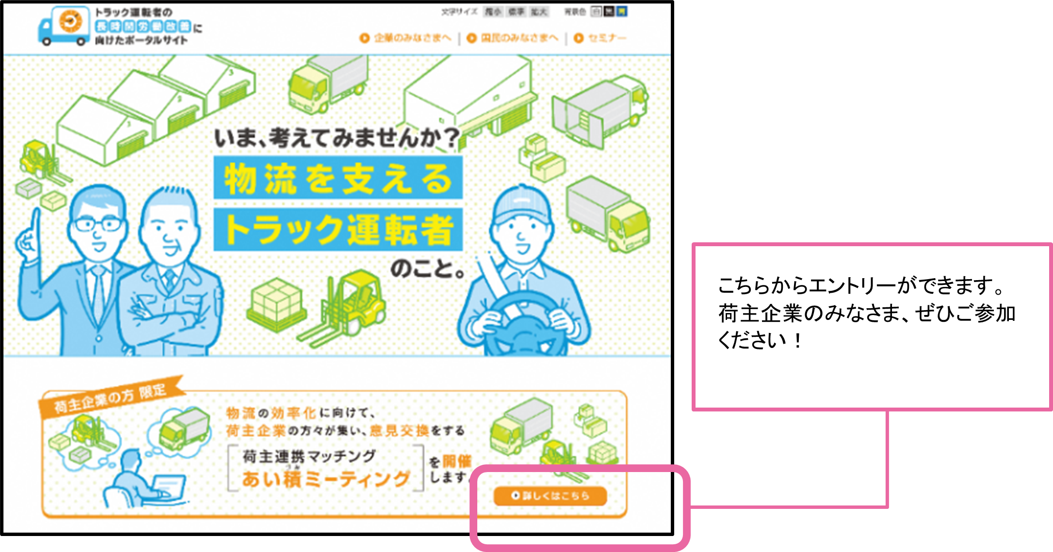 「自動車運転者の長時間労働改善に向けたポータルサイト」で募集中。 今年の11 月以降、テーマごとにオンラインミーティングを開催