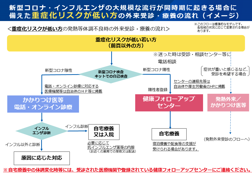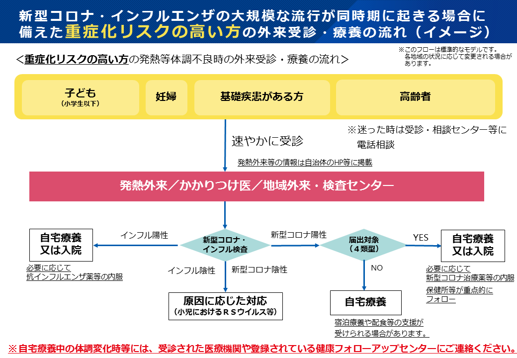 そうした事態にも対応できるよう、同時流行下に多数の患者等が生じる可能性を想定して、重症化リスク・疾患等に応じた受療行動フローをお示しした上で、新型コロナの発熱外来の強化と治療薬の供給、インフル等により受診を希望する患者の診療体制の強化、健康フォローアップセンターの拡充と自己検査キットの確保、入院治療が必要な患者への対応の強化等の備えを進めるとともに、国民の皆様への情報提供と重症化リスク等に応じた外来受診・療養への協力の呼びかけなどの対策に取り組む必要があります。