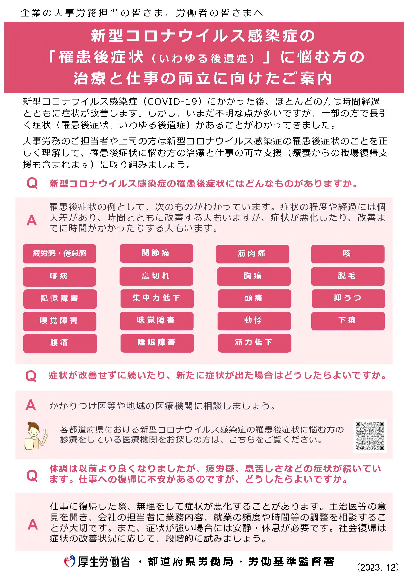 新型コロナウイルス感染症の「罹患後症状(いわゆる後遺症)」に悩む方の治療と仕事の両立に向けたご案内[259KB]