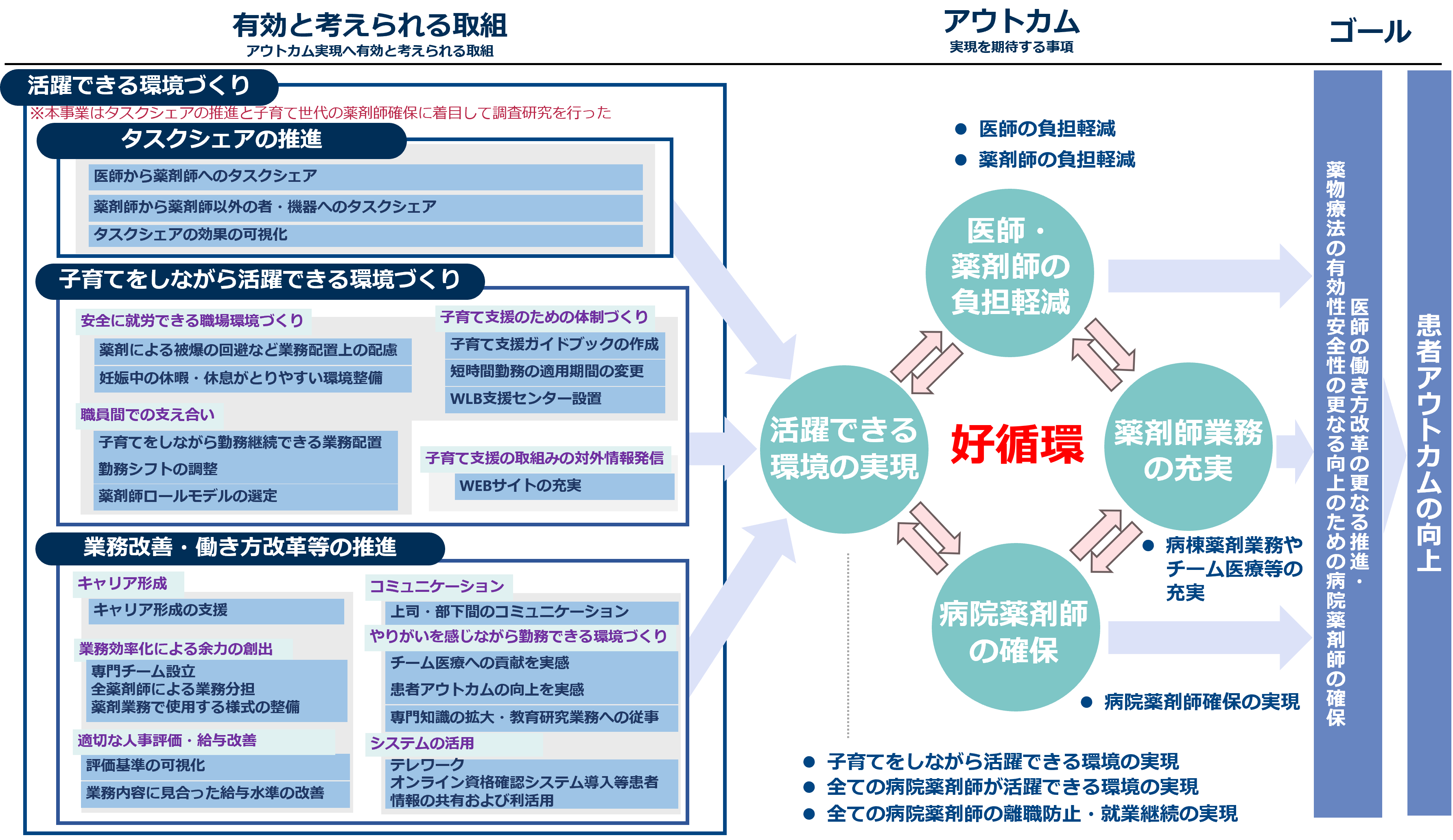 少子高齢化のさらなる進行や、今後人口減少地域が増大することが予測される中で、人口構造の変化や地域の実情に応じた医薬品提供体制を確保することが求められている。一方で、令和3年6月に公表された「薬剤師の養成及び資質向上等に関する検討会とりまとめ」では、薬剤師の従事先には地域偏在や業態偏在があり、特に病院薬剤師の確保が喫緊の課題であることが指摘されており、偏在の解消に向けた薬剤師確保の取組が重要である。