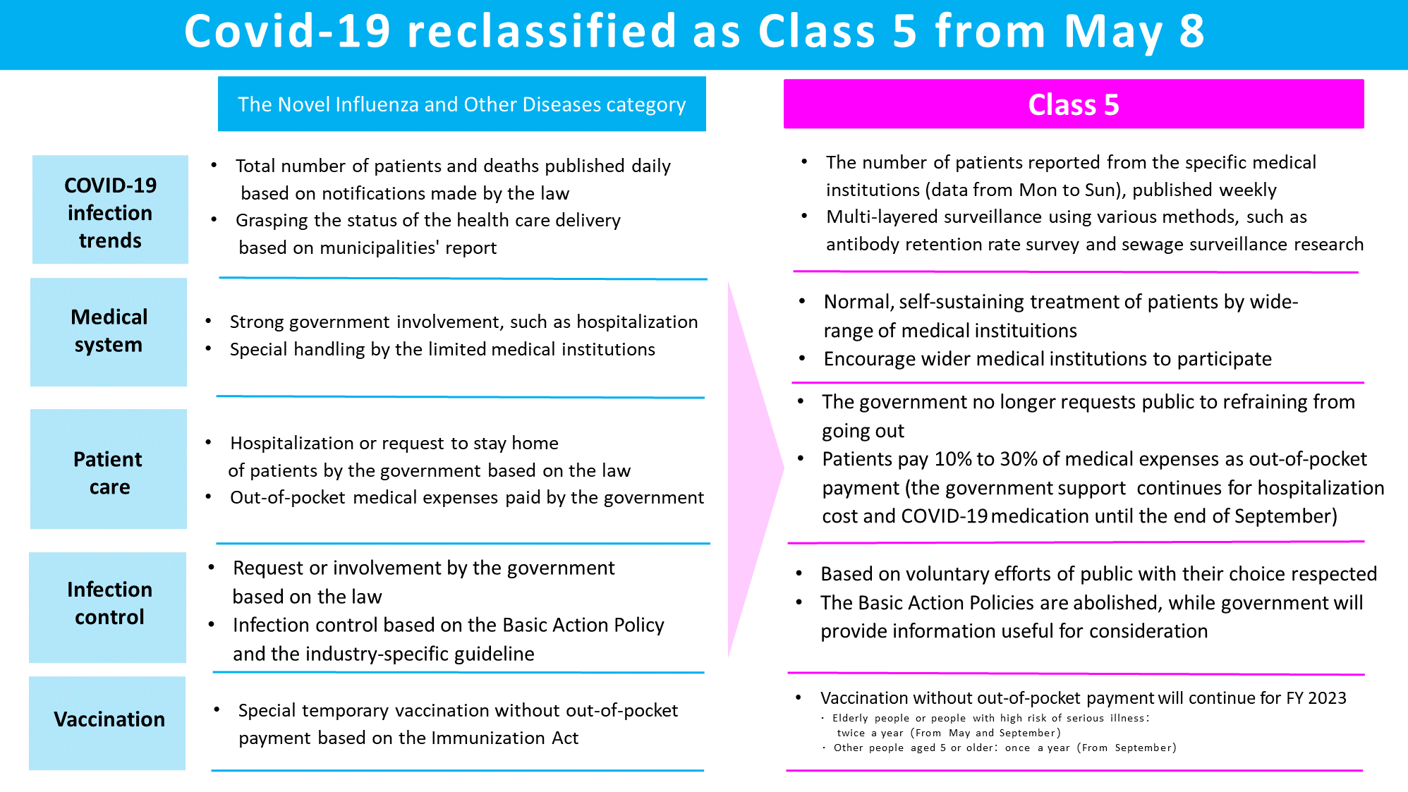 The Japanese government has taken various measures and made requests in response to COVID 19, based on relevant laws. However, due to the reclassification of COVID-19 into Class 5 on May 8, 2023, individual choice is now respected, and the implementation of infection control measures is left up to the judgement of individuals and business operators in principle.