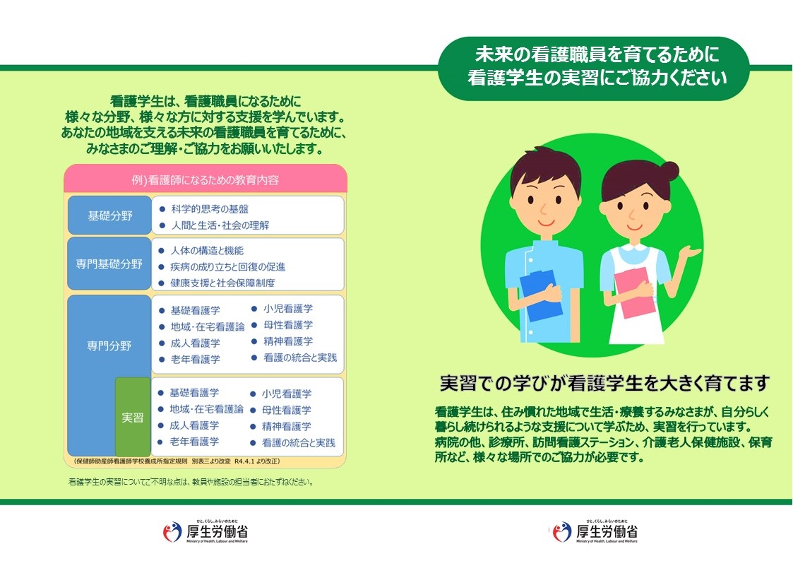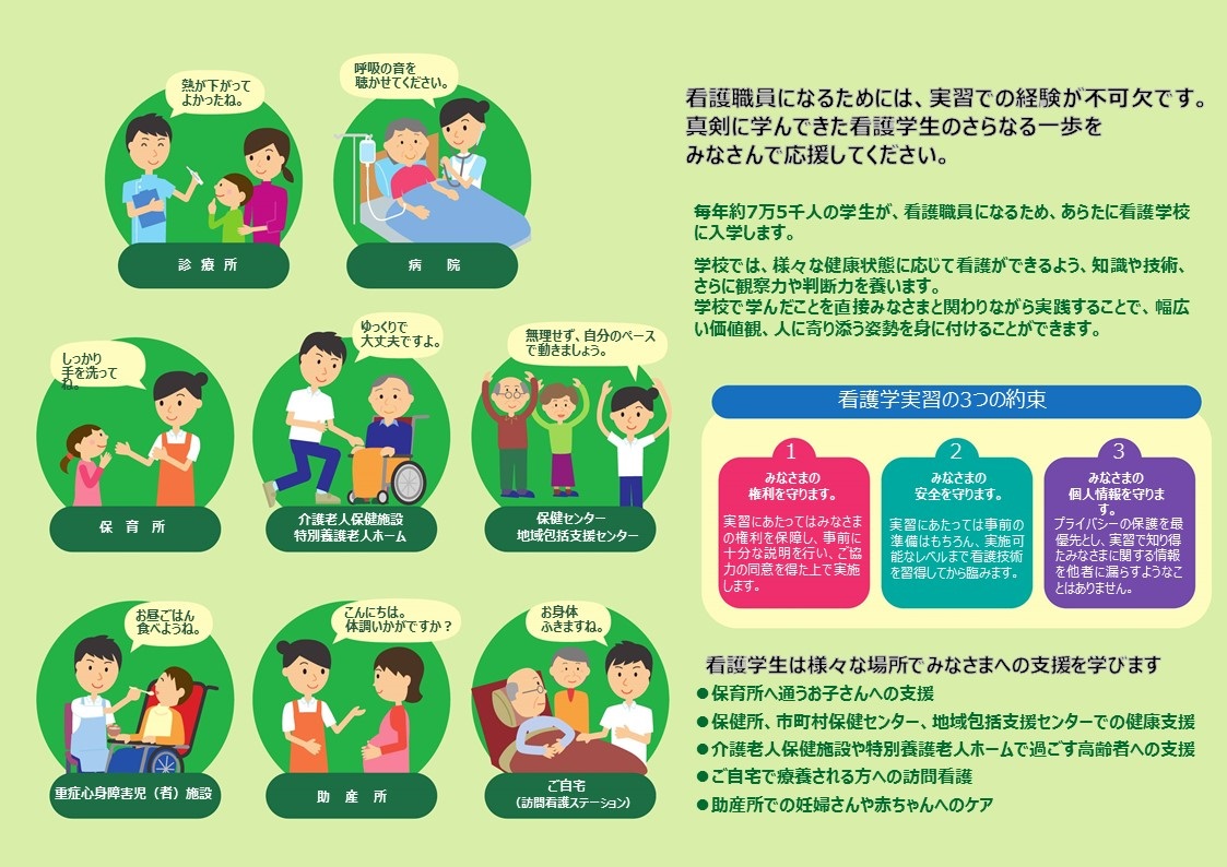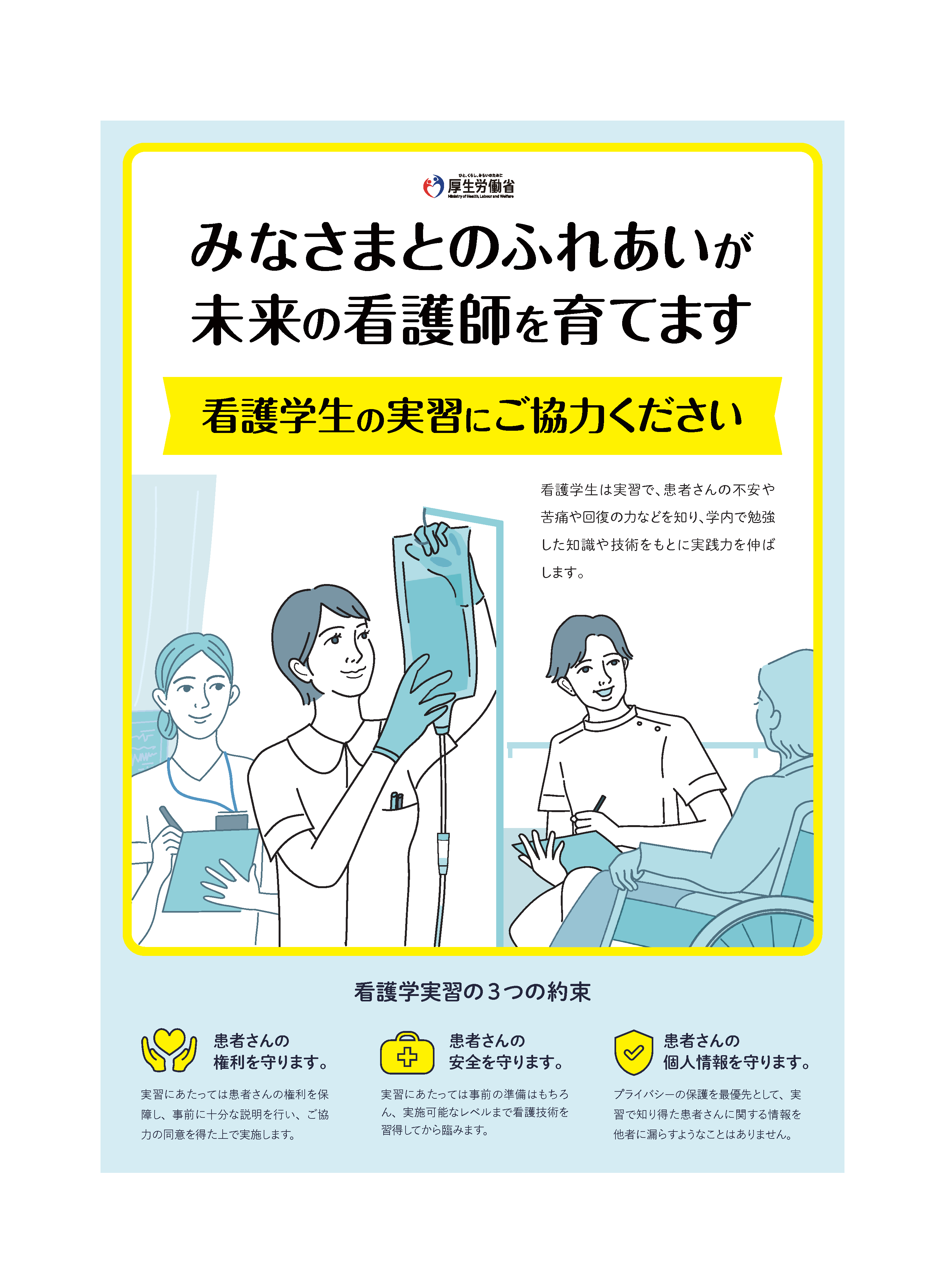 国民の看護学生の実習の必要性に関する理解・協力などを周知することを目的として、ポスター、リーフレット等の作成を行っています。