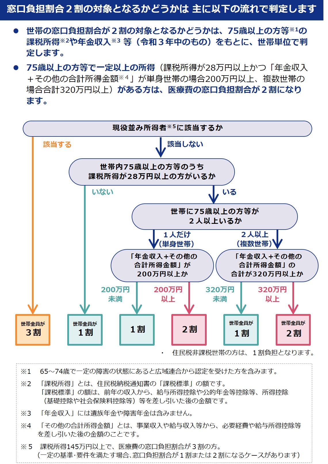 ・ご自身の負担割合が2割となるかについては、令和4年9月頃に後期高齢者医療広域連合または市区町村から、令和4年10月以降の負担割合が記載された被保険者証を交付しますので、そちらを御確認ください。