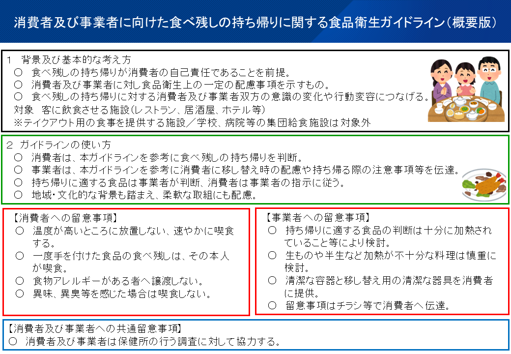 厚生労働省と消費者庁は、消費者の自己責任を前提としつつ、事業者が民事・食品衛生上留意する事項について検討を行い、令和6年12月に「食べ残し持ち帰り促進ガイドライン~SDGs目標達成に向けて~」を連名で策定しました。