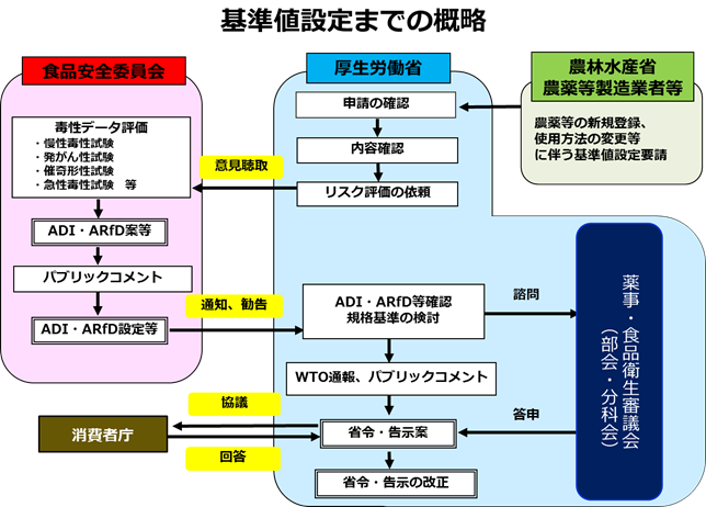 なお、このADI及びARfDは、動物を用いた毒性試験結果等の科学的根拠に基づき、リスク評価機関である食品安全委員会が食品健康影響評価(リスク評価)を行い、設定しています。これを受けて、厚生労働省において、上記の考え方に基づき、薬事・食品衛生審議会での審議を経て、残留基準値を設定しています。