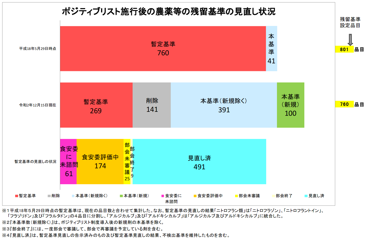 ポジティブリスト制度導入後に新規に残留基準を設定した農薬等(100品目)も含めると、残留基準が設定されている農薬等は合計で760品目あります。