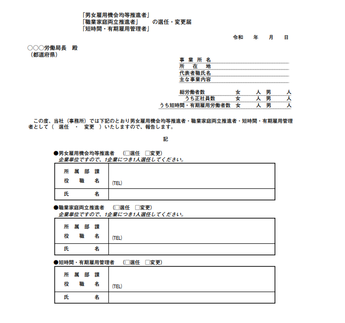 「男女雇用機会均等推進者」を新たに選任又は変更する場合は、下記の選任・変更届を都道府県労働局雇用環境・均等部(室)あてに提出ください(届出様式は、育児・介護休業法に基づく職業家庭両立推進者、パートタイム労働法に基づく短時間・有期雇用管理者の選任・変更届と共通です)。