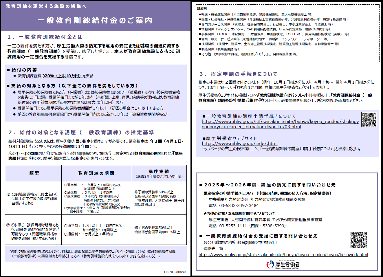 一般教育訓練の対象となる講座の指定基準等については、以下のチェックリスト、パンフレット(申請手続の要領)等を御確認ください。