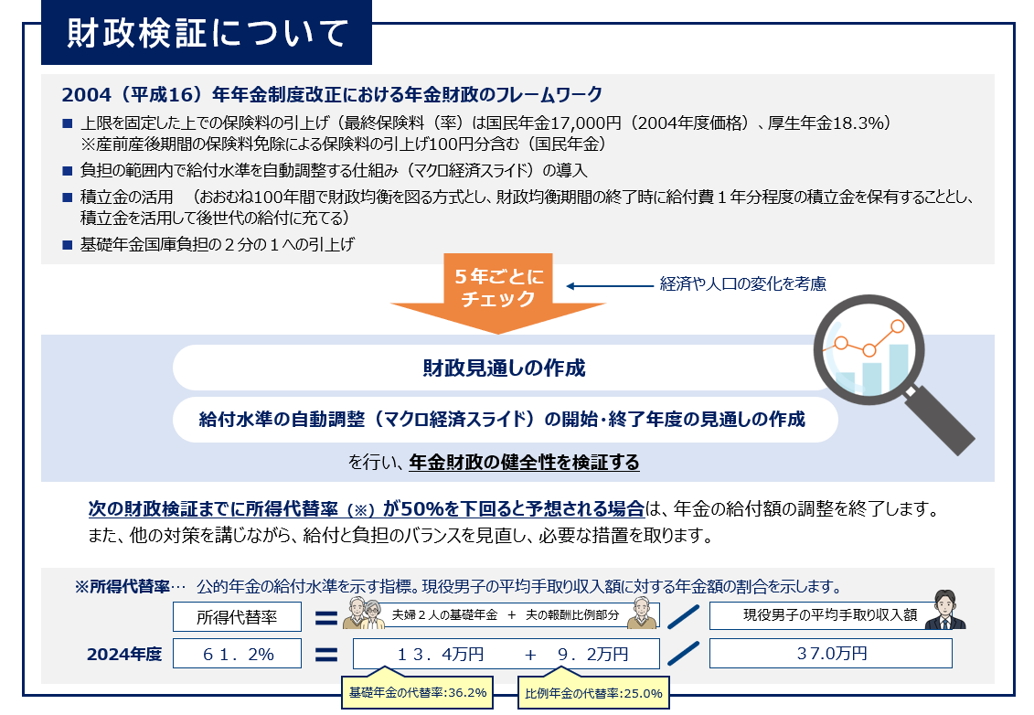 公的年金制度は長期的な制度であるため、社会・経済の変化を踏まえ、適切な年金数理に基づいて、長期的な年金財政の健全性を定期的に検証することは、公的年金の財政運営にとって不可欠なものです。このため、厚生年金保険法及び国民年金法の規定により、少なくとも5年ごとに、国民年金及び厚生年金の財政の現況及び見通しの作成、いわゆる財政検証を実施しています。